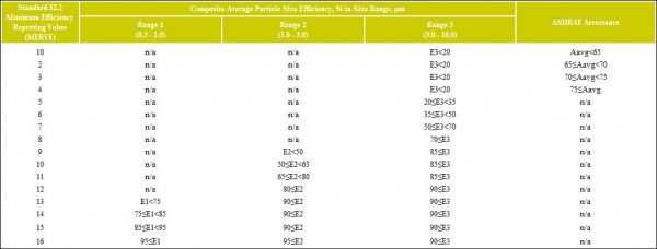 一個“整體”的報告值的52.2評??價空氣過濾器的最低能效報告的價值(MERV)的表達。MERV是單一的數(shù),即用,隨著在測試進行的空氣速度,以簡化的試驗方法,所產(chǎn)生的大量數(shù)據(jù)。MERV表示上的16點的規(guī)模和來自從PSE的三組中的每個。(見表3:MERV參數(shù))。 平均PSE為每個三組(E1,E2和E3)是參照的最小效率報告值參數(shù)(見表3:MERV參數(shù))。向上移動的適當(dāng)?shù)姆秶M(E1,E2和E3)在表3中,并記錄MERV到左側(cè)的第一個真正的語句。所有三組。 表3:MERV參數(shù)